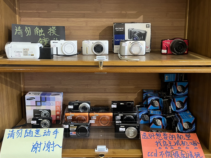 在荷蘭街一家店鋪內(nèi),一臺(tái)臺(tái)CCD相機(jī)整齊地陳列在柜臺(tái)上,松下、尼康、富士、卡西歐等品牌應(yīng)有盡有、新舊不一,機(jī)身上的細(xì)小劃痕在暖光燈下泛著金屬光澤。角落里靜靜躺著的“萬(wàn)能充”,更是瞬間將記憶拉回到那個(gè)充滿(mǎn)懷舊色彩的時(shí)代。
