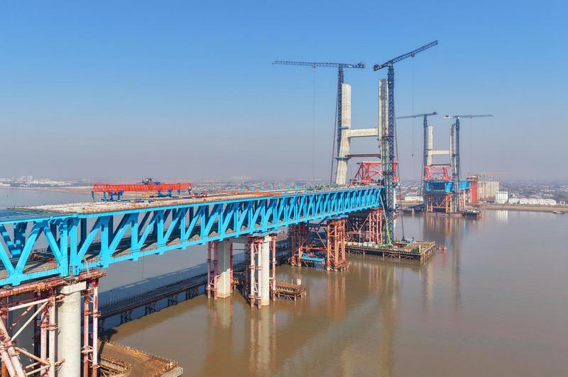 崇啟公鐵長江大橋是上海至南京至合肥高鐵控制性節(jié)點(diǎn)工程,全長4.09公里,橫跨長江入??诒敝Ш降?。其構(gòu)造為雙層布置的公鐵兩用橋,上層為雙向6車道、時(shí)速100公里的一級公路,下層為時(shí)速350公里的雙線高速鐵路+時(shí)速250公里的雙線城際鐵路。其中主通航孔橋?yàn)橹骺?00米雙塔雙索面鋼桁結(jié)合梁斜拉橋,是世界最大跨度雙塔雙索面公鐵兩用無砟軌道斜拉橋。